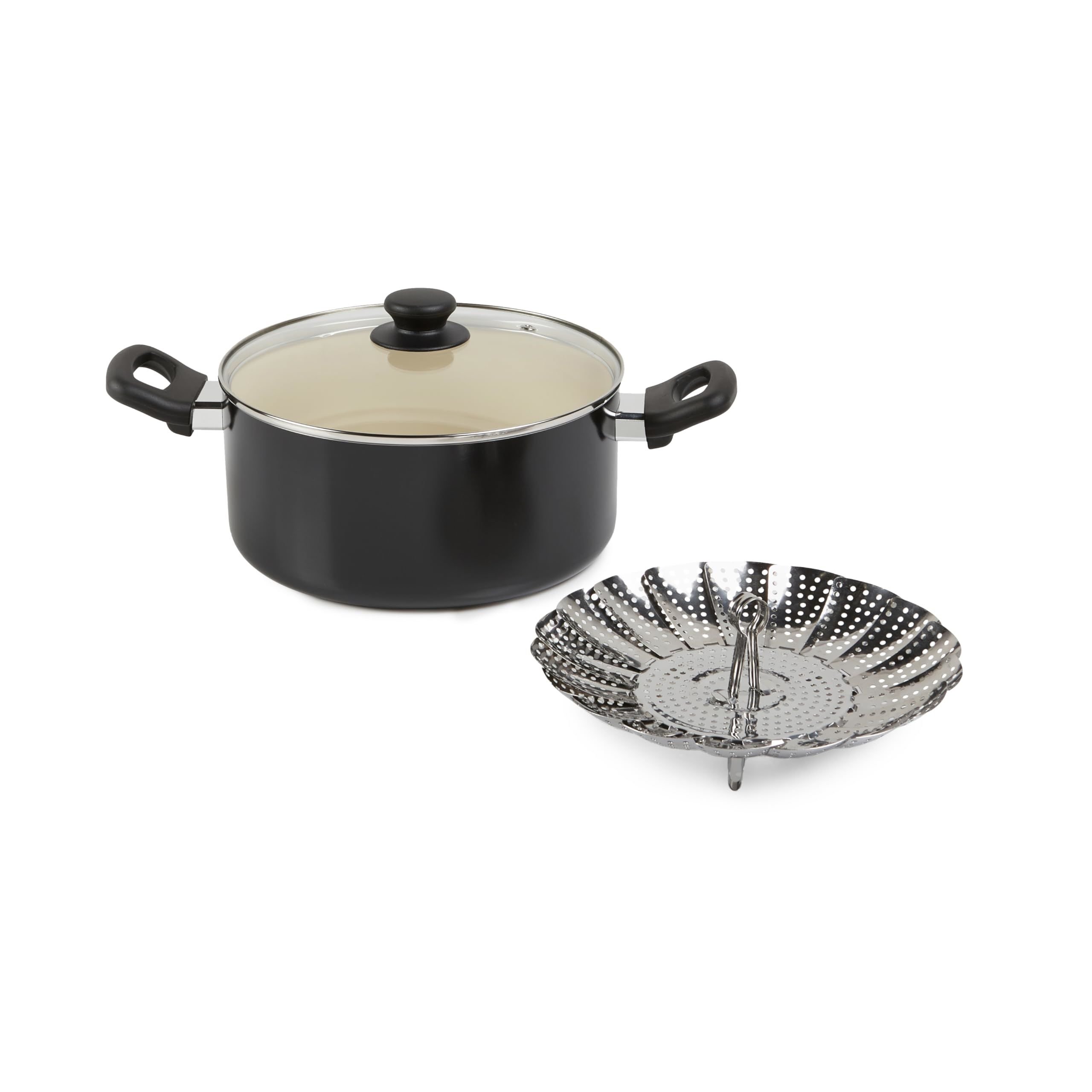 Set Includes: 4.8-inch mini frying pan, 8-inch frying pan, 1-quart 5.5-inch saucepan with lid, 2-quart 6.3-inch saucepan with lid, 3-quart 9.5-inch saute pan with lid, 5-quart 9.5-inch casserole with lid and a folding steamer insert