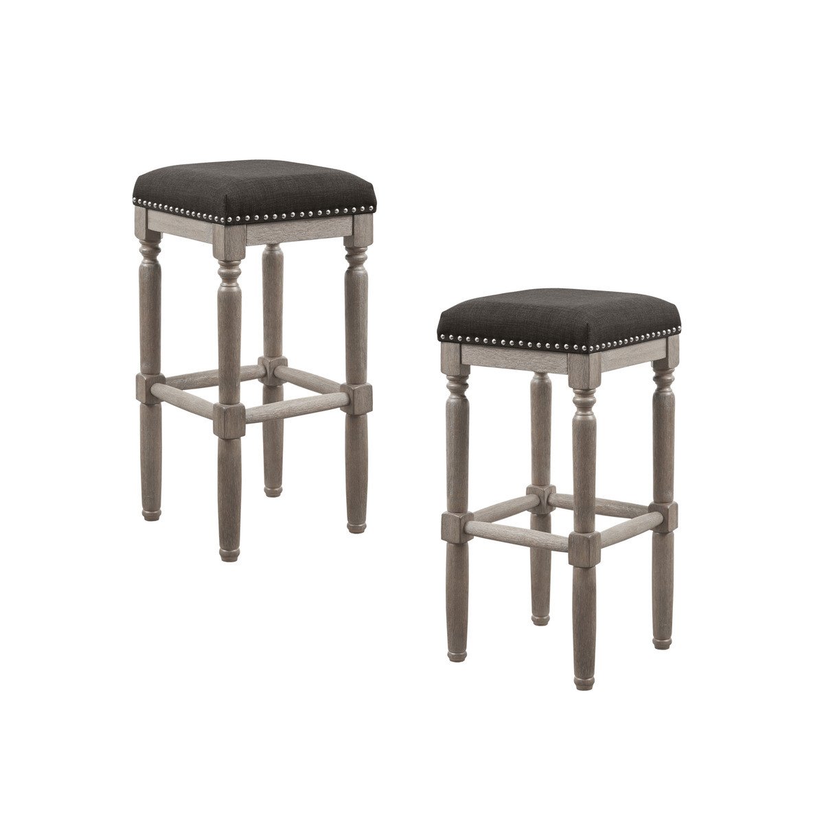 DescriptionComplete your dining or entertainment space with the Madison Park Cirque Barstool. This set of 2 stools comes in 30" seat height. The sturdy frame is constructed from solid wood in a reclaimed wood finish. The seat is upholstered in a smooth grey fabric and embellished with silver nail head accents. Assembly required.Product DetailsSee below2 Bar Stools:14"W x 14"D x 30"H(2)Seat Dimension:14.5"W x 14.5"D x 30"HSeat Cushion Thickness:3.5"TLegs Size:2"W X 26"HFootrest to Floor Height:10.25"Maximum Weight Capacity:300IbsMaterialFrame Composition: Solid wood;Leg Material: Solid wood;Wood Finish: Reclaimed Grey;Fabric Composition: 100%Polyester;Cushion or Upholstery Fill Material: Foam
