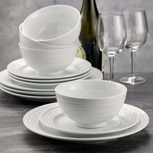 Upgrade your dining collection with the Better Homes & Gardens Porcelain 12-Piece Anniston Dinnerware Set. The set includes four dinner plates, four salad plates, and four bowls. This durable porcelain dinnerware set is conveniently dishwasher and microwave safe. This elegant Better Homes and Gardens Anniston set would pair great in any dining room with it's classic design and shape. Easy to dress up for a dinner party with friends or enjoy as a casual meal.