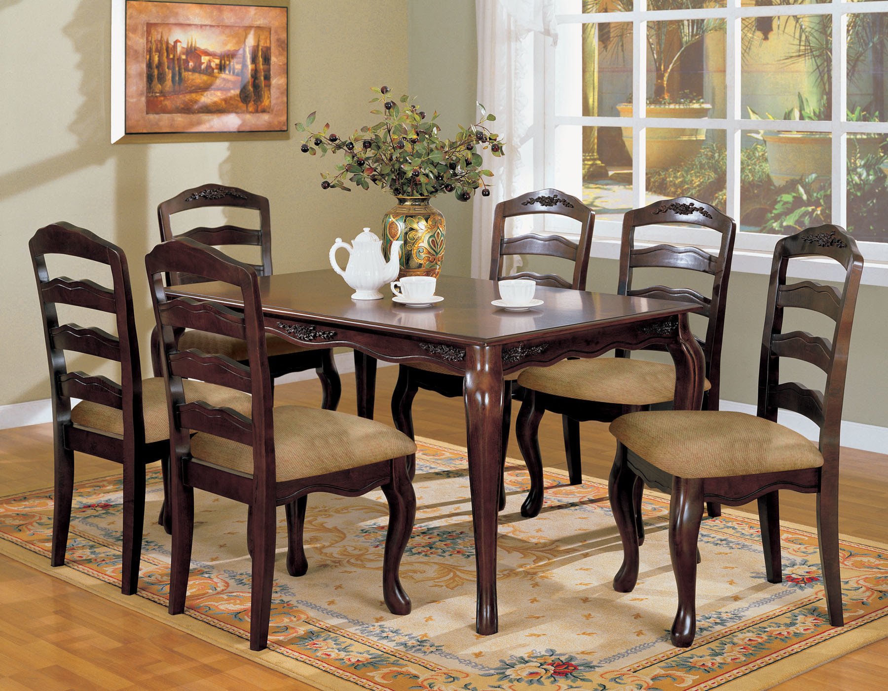 Product DescriptionProduct Description:The matching side chairs feature padded seats with a delicate floral motif. The ladder design back has soft, curvy lines instead of straight ones, while the front legs' use of Queen Anne style enforces this theme of delicateness.Product Features:TransitionalDark Walnut, TanFabric, Solid Wood, Wood Veneer, OthersLadder Back DesignFrench Style LegsPadded SeatsFloral AccentsIncludes 2 Pieces Per BoxProduct Dimension:Chair : 20 1/2"W X 23 1/2"D X 40 1/2"HListing Include: Set Of 2 Side Chairs Only.Table is Not IncludedSimple Assembly Required.